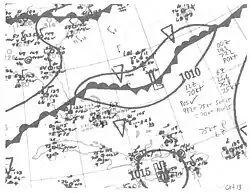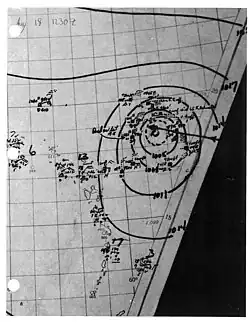 The final Atlantic hurricane of 1945 was not officially documented until over a decade following the end of the season. Using re-analyzed surface weather maps, as well as recounts from local residents along the storm's path, it was discovered that a tropical depression formed south of Jamaica in the southwestern Caribbean Sea by 12:00 UTC on October 10.[2][22] The compact storm moved north and then north-northeast ahead of a stationary front that existed from the western Atlantic into the Bay of Campeche. It became a minimal hurricane over the Cayman Islands by 00:00 UTC on October 12 and attained its peak at Category 2 intensity with winds of 100 mph (160 km/h) while making landfall along a deserted southern stretch of Cuba. The storm emerged into the Bahamas while maintaining Category 1 strength before becoming intertwined with the frontal zone and transitioning into an extratropical cyclone southwest of Bermuda.[22] The post-tropical storm slowly weakened but persisted until it was absorbed by a large extratropical low near the Azores on October 16.[2]