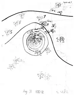 In late August, an area of disturbed weather persisted across the Bay of Campeche, eventually organizing into a tropical depression about 145 mi (233 km) northeast of Veracruz, Mexico by 00:00 UTC on August 24. The system gained steady strength on its north-northwest course, becoming a hurricane early the next day and attaining peak winds of 115 mph (185 km/h) – the first major hurricane of the season – southeast of Corpus Christi, Texas by 12:00 UTC on August 26.[2] At the time, the cyclone was thought to have possessed winds as strong as a 135 mph (217 km/h),[3] but this value was lowered in reanalysis. The hurricane made landfall along Matagorda Island, Texas at peak intensity by 12:00 UTC on August 27 and progressed inland, only slowly weakening to tropical storm intensity early the next morning. The cyclone curved northwest, ultimately dissipating southwest of the Dallas–Fort Worth metroplex around 18:00 UTC on August 29.[2]