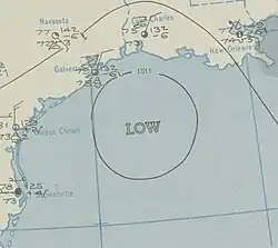 A tropical wave organized into a tropical depression in the central Gulf of Mexico by 06:00 UTC on July 19. The system moved west-northwest after formation, reaching tropical storm intensity early the next day. Despite a well-established circulation as indicated by weather balloons,[3] peak winds did not exceed 40 mph (64 km/h) throughout the storm's duration. It turned west and then west-southwest offshore the southern Texas coastline, weakening to a tropical depression early on July 22 and dissipating about 30 mi (48 km) offshore six hours later.[2] Although cyclone warnings were issued along the Texas coastline upon the storm's formation, and boats at Aransas Pass were moved into harbors, impact was negligible; winds peaked at 30 mph (48 km/h) with medium to high tides.[11] Squally weather and rough seas were observed along the coastline from Grand Isle, Louisiana to Port Aransas, Texas.[3]
