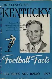 The 1947 Kentucky Wildcats football team was an American footballteam that represented the University of Kentucky as a member of the Southeastern Conference during the 1947 college football season. In its second season under head coach Bear Bryant, the team compiled an 8–3 record (2–3 against SEC opponents), defeated Villanova in the Great Lakes Bowl, and outscored all opponents by a total of 175 to 73.[1] The team played its home games at McLean Stadium in Lexington, Kentucky.