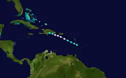 A tropical depression formed to the east of the Lesser Antilles on August 30. It moved steadily west-northwestward,[8] passing over Barbados as a weak tropical storm.[6] Seven people drowned on the island and 27 houses were destroyed in Bridgetown.[9] On Dominica, winds uprooted some trees, while rough seas damaged roads, jetties, and Landings.[15] After entering the Caribbean Sea on September 1, hostile conditions weakened the storm, and the third tropical cyclone of the season degenerated into a tropical wave on September 3 to the south of the eastern tip of the Dominican Republic.[8]