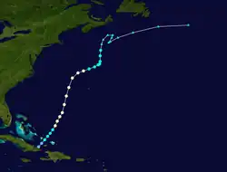 A tropical wave developed into a tropical storm east of Puerto Rico on September 3. It moved northward and strengthened to a hurricane later that day, but then weakened to a strong tropical storm the next day. At the same time, the system halted its forward motion and began to drift eastward. Early on September 5, it re-intensified into a hurricane, and it became a major hurricane on September 6. The storm turned to the north on September 7 and passed about 65 mi (105 km) east of Bermuda on September 8.[8][6] The hurricane weakened as it accelerated northeastward over cooler waters, and became extratropical on September 10 near Atlantic Canada. Shortly after becoming extratropical, it passed over Newfoundland, and ultimately dissipated on September 11 near southwestern Greenland.[8]