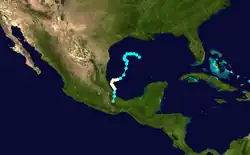 A tropical wave entered the Gulf of Mexico on September 18.[8] It moved northwestward and developed into a tropical storm on September 20, while offshore Louisiana. The storm continued northwestward, then turned to the southwest, and erratically looped to the south on September 22. Steadily strengthening as it tracked south-southwestward, the storm intensified into a hurricane on September 24. After turning to the southwest, it reached its peak intensity on September 25. The hurricane weakened as it turned to the south-southeast then south and fell to tropical storm intensity shortly before making landfall between Veracruz and Nautla. The system dissipated by September 26.[6] Operationally, the storm was treated as two separate storms, due to reconnaissance aircraft being unable to report a center of circulation on September 23.[8] The storm produced 2 to 3 ft (0.61 to 0.91 m) higher than normal tides along the coast of Texas and Louisiana, while its outer rainbands produced locally heavy rainfall.[8]