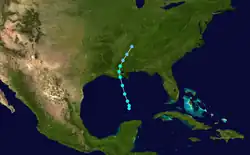 A tropical depression formed in the eastern Pacific Ocean just offshore Guatemala on September 27. The depression drifted northwestward and made landfall in Guatemala on September 28. It crossed southeastern Mexico and entered the Gulf of Mexico near Ciudad del Carmen on October 1. Shortly after entering the Gulf of Mexico, the system strengthened into a tropical storm and became a hurricane on October 2. It turned more to the north and intensified to a strong Category 2 hurricane on October 3. Subsequently, the storm made landfall near Freeport, Texas, on October 4 at the same intensity. The hurricane rapidly weakened to a tropical storm as it turned northeastward over land. On October 6, it weakened to a tropical depression over Missouri and later became extratropical. The storm accelerated northeastward and dissipated near Chicago.[6]