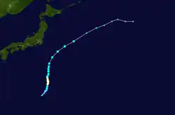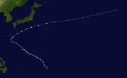 Typhoon Hester formed on December 27, 1952, southeast of Majuro.[3][4] It rapidly intensified, becoming a tropical storm by December 28 and a typhoon the same day. Moving north of the Caroline Islands, Hester underwent rapid intensification, reaching Category 5 super typhoon status with winds of 185 mph (295 km/h) and a central pressure of 905 hPa by December 31, just south of the Mariana Islands.