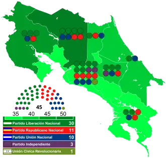 Party Votes % Seats +/– National Liberation Party 86,081 41.68 20 –10 Republican Party 46,171 22.36 11 +8 National Union Party 44,125 21.37 10 +9 Independent Party 20,314 9.84 3 New Revolutionary Civic Union 6,855 3.32 1 New Democratic Opposition Movement 1,417 0.69 0 New Democratic Party 939 0.45 0 –11 National Republican Party 614 0.30 0 New Total 206,516 100.00 45 0 Valid votes 206,516 89.98 Invalid/blank votes 22,991 10.02 Total votes 229,507 100.00 Registered voters/turnout 358,661 63.99 Source: TSE , Election Resources