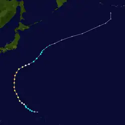 Tropical Storm Alice developed on July 14 in the open western Pacific Ocean. It moved to the northwest and attained typhoon status on the 16th. Alice rapidly intensified on the 19th to a 150-mile-per-hour (240 km/h) super typhoon, and after turning to the northeast it weakened. Alice hit southeastern Japan on the 22nd, and became extratropical on the 24th near the Kamchatka Peninsula.[5]