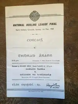On 1 May 1960, Tipperary won the title after a 2-15 to 3-8 win over Cork in the final. It was their second league title in succession and their 9th league title overall.[1]