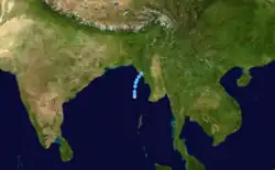 Deep Depression Two existed from May 24 to May 25.[4] The storm moved from south to north throughout its two-day lifetime. It first formed early on May 24 moving northward in the northeast Bay of Bengal, then started moving northeastward later in the day. The storm made a tropical depression-strength landfall on western Myanmar on May 25 and quickly dissipated afterward.