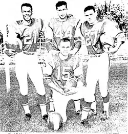 Offensive backfield. Quarterback Glen Ray kneeling. Standing from left to right: halfback Barry Roach, fullback Steve Kun; and halfback Leo Reimer.