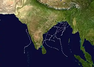 The 1965 North Indian Ocean cyclone season had no bounds, but cyclones tend to form between April and December, with peaks in May and November. The season has no official bounds but cyclones tend to form between April and December. These dates conventionally delimit the period of each year when most tropical cyclones form in the northern Indian Ocean. There are two main seas in the North Indian Ocean—the Bay of Bengal to the east of the Indian subcontinent and the Arabian Sea to the west of India. The official Regional Specialized Meteorological Centre in this basin is the India Meteorological Department (IMD), while the Joint Typhoon Warning Center releases unofficial advisories. An average of four to six storms form in the North Indian Ocean every season with peaks in May and November.[1] Cyclones occurring between the meridians 45°E and 100°E are included in the season by the IMD.[2]