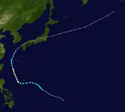 On September 14, Hurricane Sarah, which formed across the International Date Line, entered the Western Pacific. Immediately after the first advisory following Sarah's entrance into the West Pacific, it was upgraded to a minimal typhoon. Typhoon Sarah continued to intensify, and late on September 15, it was upgraded to a Category 4 typhoon. The next day, Sarah reached its peak intensity, attaining 150 mph winds and a 932 millibar (mbar) pressure reading (this was the only pressure measurement retrieved from the typhoon), making the system a super typhoon. Sarah began gradually weakening afterwards, and late on September 21, it became extratropical; it was still an 80 mph Category 1 typhoon at the time.