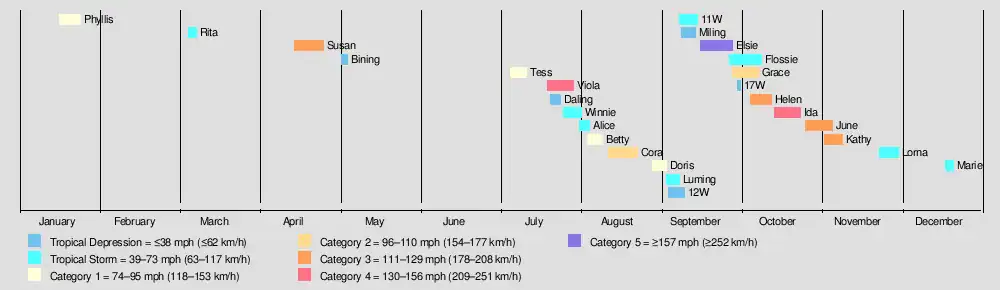 | Elsie (Narsing) | September 16–28 | Typhoon | 280 km/h (175 mph) | 895 hPa (26.43 inHg) | Mariana Islands, Taiwan, Ryukyu Islands, China | Unknown | 102 | |