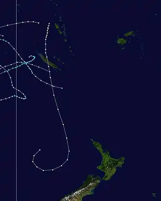 During December 15, a small tropical depression developed about 278 km (175 mi) to the north of Yasawa-i-Rara in Fiji's Yasawa Islands.[1] Over the next day, the system drifted westwards, before it started to move southwards and intensify further.[1] The system subsequently became equivalent to a modern-day category 1 tropical cyclone, with 10-minute sustained wind speeds of 75 km/h (45 mph) during December 17.[1][2] During that day, the system passed about 95 km (60 mi) to the west of Nadi and started to move south-eastwards and passed well to the south of Ono-I-Lau during December 18.[1] The system was last noted during the next day, after it had moved below 25S and out of the tropics.[1] It was thought that the system caused gale-force winds in parts of Viti Levu, Vatulele, Kandavu and the Yasawa and Mamanutha group of islands.[1]