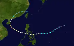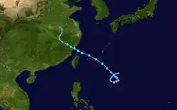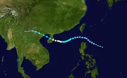 A disturbance in the ITCZ became a tropical depression on July 5. It headed northwest over the Philippines. It intensified into a tropical storm almost immediately after entering the South China Sea on July 8. It then turned north, and erratically drifted and looped for four days. On July 11, Susan became a typhoon. On July 14, Susan moved close to the Taiwan Strait. It made landfall on the coast of Fujian province, and dissipated inland on July 15.[8]