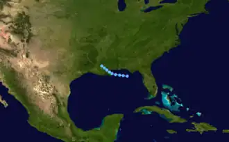 Tropical Depression Six developed from a trough of low pressure in the northeastern Gulf of Mexico about 60 mi (97 km) southwest of Cape San Blas, Florida, on July 27.[3][7] The depression moved west-northwestward and strengthened slightly to reach winds of 35 mph (56 km/h), but remained below tropical storm intensity and made landfall in eastern Louisiana. Once inland, the depression slowly weakened and re-curved northwestward on July 30 into Mississippi. Around that time, the depression dissipated.[3] The remnants persisted at least until August 3, at which time it was situated over Arkansas.[13]