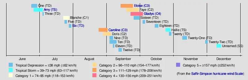 Tropical cyclogenesis began in June, with the development of a tropical depression on June 24, followed by Tropical Storm Amy on June 27. Four systems originated in July, including Hurricane Blanche. After Tropical Depression Six dissipated on July 30, tropical activity went dormant for over three weeks, ending with the development of Hurricane Caroline on August 24. Another cyclone, Hurricane Doris, also formed in August. September was the most active month of the season, featuring eight tropical cyclones, including hurricanes Eloise, Faye, and Gladys. In October, four systems formed, one of which intensified into Tropical Storm Hallie. Two tropical depressions developed in November. The last system, a subtropical storm, formed on December 6 and transitioned into an extratropical cyclone on December 13.[3]