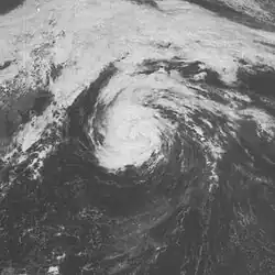 Doris made meteorological history when, on August 31, it became the first Atlantic hurricane ever to be upgraded to hurricane intensity solely on the basis of satellite pictures,[1] via the Dvorak technique.[7] The cyclone then curved northward and intensified further during the next few days, becoming a Category 2 hurricane early on September 2.[3] Based on the Dvorak technique, it is estimated that Doris peaked with maximum sustained winds of 110 mph (180 km/h) and a minimum barometric pressure of 965 mbar (28.5 inHg) shortly thereafter. By September 3, the hurricane began interacting with a non-tropical low pressure area.[7] On the following day, Doris quickly weakened to a tropical storm and transitioned into an extratropical cyclone about 830 mi (1,340 km) south-southeast of Cape Race, Newfoundland, around 06:00 UTC. The extratropical remnants weakened and then dissipated late on September 4.[3]