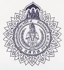 The emblem of 1975 Thailand National Games was the blue circle, with the Phra Prang Sam Yod, the temple in Lopburi on top, the emblem of Sports Authority of Thailand on the inside, and surrounded by the text