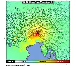 The 1976 Friuli earthquake, also known in Italy as Terremoto del Friuli (Friulian earthquake), occurred on 6 May 1976, at 21:00:13 (20:00:13 UTC) with a moment magnitude of 6.5 and a maximum EMS intensity of X (very destructive).[3] The shock occurred in the Friuli region in northeast Italy near the town of Gemona del Friuli. 990 people were killed,[5] up to about 3,000 were injured, and more than 157,000 were left homeless.