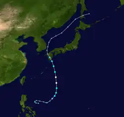 The monsoon trough spawned Tropical Depression 7W on June 20. It headed westward, slowly organizing into a tropical storm on the 23rd. Ruby turned to the northwest, and reached typhoon strength just before hitting Luzon on the 25th. It crossed the island, weakening to a tropical storm before turning to the northeast in the South China Sea. Ruby again became a typhoon on the 28th, and on July 2, the typhoon reached a peak of 140 mph (230 km/h) winds while south of Japan. The typhoon turned to the east, and became extratropical on the 3rd. 16 people were killed from the typhoon.