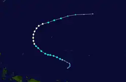 The monsoon trough spawned a tropical depression east of the Philippines on May 10. It tracked generally westward, reaching tropical storm status on the 13th while remaining poorly organized. On the 14th Olga relocated to the southeast, and regained tropical storm strength after weakening. The storm headed to the northwest, and looped in response to the approach of a long wave trough. After returning to a westward movement Olga, despite unfavorable wind shear, strengthened to a typhoon on the 20th. It rapidly intensified that night, and hit eastern Luzon early on the 21st as a 115 mph (185 km/h) typhoon. It drifted across the island, and turned northward in the South China Sea. Olga moved rapidly to the northeast, and on the 28th Olga was absorbed by a subtropical disturbance. Olga brought torrential flooding, at some points as much as 50 inches (1,300 mm) of rain. Because of this, 374 people were killed and thousands were left homeless. Olga also destroyed many of the sets used during the filming of Apocalypse Now.