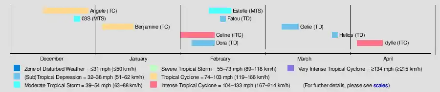 Angele form on December 13, while stationed in the middle of the Mozambique Channel. It traveled north and gradually organized into a tropical storm while performing a tight counter-clockwise loop. On December 18 Angele intensified into a tropical cyclone before making landfall on Mozambique. Angele weakened to a tropical storm while over land, but re-intensified back to a tropical cyclone as it re-emerged into the Mozambique channel. The cyclone moved south and quite abruptly, on December 23, moved to the northeast. On December 24 Angele reached a peak intensity as a category three cyclone. The system weakened slightly before making landfall on Madagascar two days later. The weak storm moved over the open Indian Ocean and translated into an extra-tropical storm.