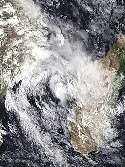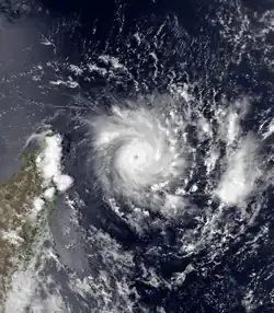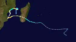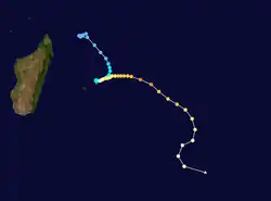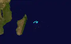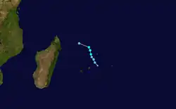 Celine existed from January 31 to February 12. Celine looped near Mauritius while intensifying, and later passed just north of Rodrigues. Wind gusts on the latter island reached 216 km/h (134 mph).[3] The storm killed about half of the population of the critically endangered Rodrigues flying fox.[4]