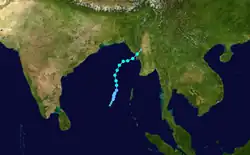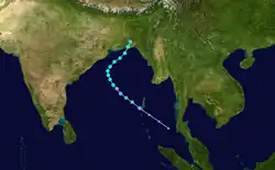 Another tropical depression formed in the Bay of Bengal on October 25 and moved northwestward.[1] The depression became a cyclonic storm the following day[3] The storm then turned to the northeast and then back to the northwest[1] were its winds peaked at 45 mph (70 km/h) before dissipating off the coast of Bangladesh on October 28.[3]