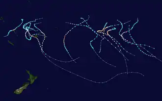 The 1982–83 season was one of the most active and longest South Pacific tropical cyclone seasons on record, with fourteen tropical cyclones and nine severe tropical cyclones occurring within the South Pacific basin between 160°E and 120°W.[1] During the season, tropical cyclones were primarily monitored by the Fiji Meteorological Service, which issued high seas and tropical cyclone warnings for the region between the Equator and 25°S, 160°E and 140°W.[2] Tropical cyclones that moved below 25S were monitored by the New Zealand Meteorological Service (NZMS), while those that were located to the west of 160E were monitored by the Australian Bureau of Meteorology as a part of the Australian region.[3] During the season, several tropical cyclones formed to the east of the International Dateline and out towards 120°W, which caused significant problems for the FMS, as the eastern edge of its satellite coverage was restricted to around 155°W.[2] As a result, the FMS were dependent on data from other weather services including the United States Joint Typhoon Warning Centre, the Naval Western Oceanographic Centre, Central Pacific Hurricane Center as well as the Tahiti Meteorological Services. The NZMS also had to take over Fiji's regional responsibilities for a few days, while Severe Tropical Cyclone Oscar impacted Fiji and caused a communications outage.[2]