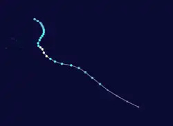 After the season had ended, meteorologists at the University of Hawaiʻi identified two tropical depressions, that existed to the east of 130°W on May 11 and May 16, 1983.[25] Further research into the tropical depression of May 11, by Luis Muñoz Leyton from the Universidad de Valparaíso and José Vicencio from the Chilean Weather Service suggests that the system became an unnamed tropical storm.[26] According to estimates made using the Dvorak technique, the highest sustained wind intensity was close to 65 knots (120 km/h), recorded during the night of May 13, with an estimated minimum pressure between 981 hPa and a Dvorak classification of T4.0, being classified as a category 2 severe tropical cyclone on the Australian and South Pacific cyclone scale. During the early hours of May 14, it began to weaken until it disintegrated on the same day around 12.9°S 115.8°W.[27]