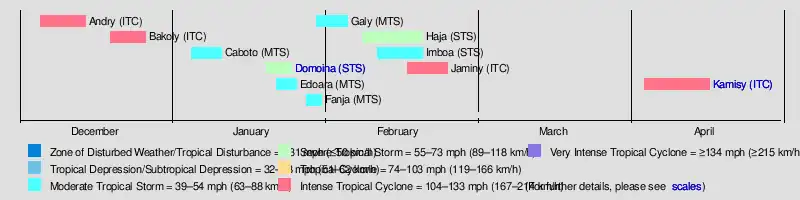 During the season, the Réunion Meteorological Service tracked storms in the basin, using the Dvorak technique to estimate tropical cyclone intensities via satellite imagery.[1] The agency later became Météo-France's meteorological office at Réunion (MFR). At the time, the basin extended from the east coast of Africa to 80° E.[2] Eleven storms were named by the Mauritius Meteorological Service and the Madagascar Meteorological Service.[1] The rest of the naming list was Lalao, Monja, Nora, Olidera, Pelazy, Rija, Saholy, Tsira, Vaosolo, Wilfredy, Yannika, and Zozo.[3] The 11 named storms were slightly above the normal of 9, most of which formed in January and February. There were four intense tropical cyclones, which is twice the average. The increased activity of the season was in part due to enhanced easterlies, a strong monsoon trough, and warm water temperatures around 28 °C (82 °F) which extended to 25° S.[4]