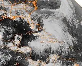 Flooding was also reported in Hispaniola and eastern Cuba.[4] In Cuba, a state of alert was declared for Santiago de Cuba, Guantanamo, Granma, and Holguin provinces, and 7,500 people were evacuated. Heavy rainfall caused landslides and isolated several towns after roads and rails were blocked. Some areas lost power or telephone services.[7] Five people were killed in Cuba, four of whom from drowning and one from electrocution.[9] In nearby Haiti, flooding was worst in Les Cayes,[7] where the Ravine River destroyed many homes and left 1,300 homeless.[9][10] Throughout the country, flooding severely damaged crops and wrecked bridges and roads. There were 21 deaths in the Les Cayes area.[10] In the Dominican Republic, there were 12 deaths around Santo Domingo after mudslides buried people. Four towns were isolated after rivers exceeded their banks, forcing hundreds of people to evacuate.[9] Overall, the system caused 94 deaths and $25 million in damage.[4]