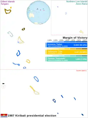 The opposition was energised by Tabai's victory in 1983 and the subsequent controversy around his fishing agreement with the Soviet Union.[10] Tabai denied that the fishing agreement was a factor in the elections, insisting that it was no longer a relevant issue.[11] National politics were a greater factor in 1987 than they were in previous elections, as the Soviet fishing agreement and other polarising debates between the government and the opposition shifted the focus of the public. The opposition organised under the label of the Christian Democratic Party, but this did not function as a true political party and the candidates ran as independents.[12][13] Both Tabai and Tito limited their campaigning to the islands where they were most popular—Tabai in the south and Tito in the north—forgoing any attempt to garner votes from the other candidate's strongholds.[14]