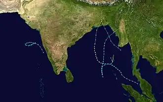 The 1988 North Indian Ocean cyclone season was a below average season. The season has no official bounds but cyclones tend to form between April and December. These dates conventionally delimit the period of each year when most tropical cyclones form in the northern Indian Ocean. There are two main seas in the North Indian Ocean—the Bay of Bengal to the east of the Indian subcontinent and the Arabian Sea to the west of India. The official Regional Specialized Meteorological Centre in this basin is the India Meteorological Department (IMD), while the Joint Typhoon Warning Center (JTWC) releases unofficial advisories. An average of five tropical cyclones form in the North Indian Ocean every season with peaks in May and November.[1] Cyclones occurring between the meridians 45°E and 100°E are included in the season by the IMD.[2]