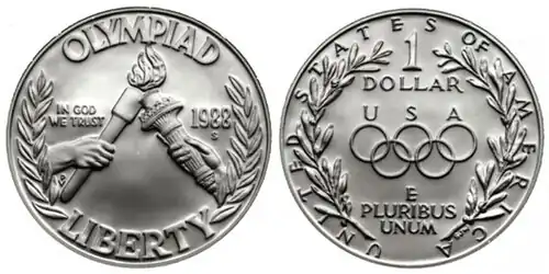 The obverse of the 1988 Olympic commemorative dollar, designed by Patrica L. Verani, features Lady Liberty's torch and the Olympic torch merging into a single symbolic flame with an olive branch encircling the torches. The reverse, designed by Sheryl J. Winter, features the five-ring logo of the U.S. Olympic Committee, framed by a pair of olive branches.[2]