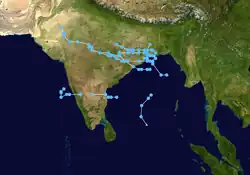During the withdrawal phase of the south-west monsoon on October 7, the IMD reported that a depression had developed over the northern Bay of Bengal.[9] During that day the system moved north-westwards and made landfall on the coast of Odisha and West Bengal as a Deep Depression.[9] The system subsequently came under the influence of a westerly trough of low pressure and recurved towards the northeast, before it dissipated over West Bengal during October 9.[9] 370 deaths were recorded in Bangladesh in association with this system, while a storm surge affected Chittagong and caused extensive damage to two offshore islands.[10][11][14] A search and rescue operation was launched after 350 boats and trawlers failed to return to port and 5000 fishermen failed to return to port after the system.[11][14] On November 14, the IMD reported that a depression had developed out of a pre existing disturbance, that was located over the south-west Bay of Bengal near the Tamil Nadu Coast.[9] During that day the system moved westwards and made landfall on the Northern Tamil Nadu and Southern Andhra Pradesh coasts before it rapidly weakened into an area of low pressure.[9] The remnants subsequently crossed the Indian Peninsular and emerged into the Arabian Sea during November 16, before they intensified into a Deep Depression during November 17.[9] The system subsequently recurved towards the northeast, before the system dissipated over the sea during November 18.[9]