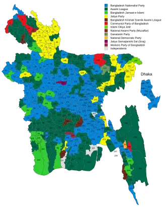 The elections saw the BNP win 140 of the 300 directly elected seats, 11 short of a parliamentary majority. The BNP's primary rivals, the Awami League, led by Sheikh Hasina, won only 88 seats. However, there was little difference between the two main parties in terms of the popular vote share, with BNP only receiving around 250,000 votes more than the Awami League.[2]