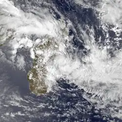 The ITCZ remained active in early March, spawning a tropical depression in the northern Mozambique Channel on March 2. It failed to organize at first, although an increase in convection on March 3 allowed the system to strengthen into Tropical Storm Ionia.[4] That day, it attained peak winds of 65 km/h (40 mph).[16] After passing about 50 km (30 mi) north of Juan de Nova island, Ionia progressed southeastward and approached the western Madagascar coastline. The circulation paralleled the coast for about 250 km (160 mi) before moving ashore at Belo on March 4. The storm weakened over land, re-emerging over open waters on March 5 from southeastern Madagascar. Ionia briefly re-intensified into a tropical depression that night,[4] but it lost tropical characteristics on March 7.[16] The remnants persisted several more days until dissipating south of the Mascarene Islands on March 11.[4]