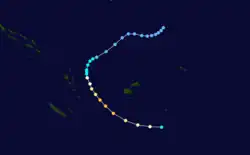 Early on December 26, the JTWC started to monitor a tropical disturbance that had developed about 575 km (355 mi) to the south-east of Nauru.[3] Over the next couple of days the disturbance gradually developed as it moved towards the south-southwest under the influence of a north-easterly flow.[4] Early on December 28, TCWC Nadi started to monitor the disturbance as a tropical depression.[5] Later that day, the JTWC classified the depression as Tropical Cyclone 05P, before TCWC Nadi reported that the system had intensified into a category 1 tropical cyclone on the Australian tropical cyclone intensity scale and named it Rewa.[5][6][7] Over the next few days, the system gradually intensified under the influence of favourable upper-level winds while it moved towards the south-southwest, passing through the Solomon Islands on December 29 and affecting the southeastern islands of Papua New Guinea.[4][8] As it moved through the Solomon Islands, Rewa moved out of the South Pacific basin and into the Australian region.[5]