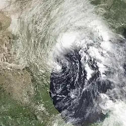 Tropical Depression Ten developed about 185 mi (298 km) southeast of Bermuda at 18:00 UTC on September 29.[10] Initially, convection associated with the depression was confined to north and east of the center.[64] The depression was difficult to track, though wind observations in Bermuda suggested that it passed just north of the island between 0300 and 07:00 UTC on September 30. Although no intensification was predicted, the National Hurricane Center noted that interaction with the approaching cold front could result in baroclinic strengthening.[65] The depression did not organize further and merged with the cold front at 00:00 UTC on October 1.[10]