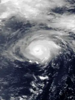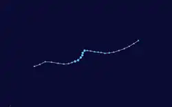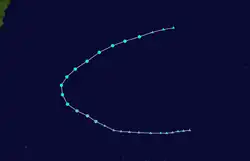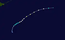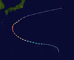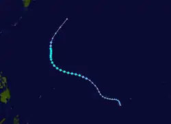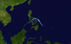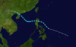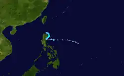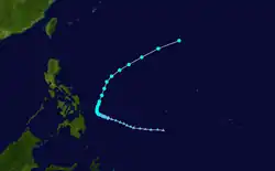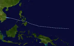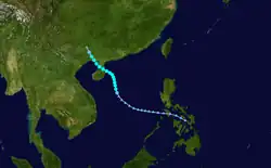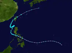 A tropical wave was detected by the Joint Typhoon Warning Center on August 24. On August 25, it was classified as Tropical Depression 12W by the JTWC.[10] The Japan Meteorological Agency (JMA) also upgraded the disturbance to a tropical depression later that day.[11] At the same time, the Philippine Atmospheric, Geophysical and Astronomical Services Administration (PAGASA) named 12W, Gening from its list of pacific typhoon names.[12] On August 26, Gening intensified into a tropical storm and was named Kent by the Joint Typhoon Warning Center.[10] Kent then quickly intensified into a typhoon on August 27 as it drifted slowly west-northwest. It quickly intensified and reached peak intensity as a Category 4 super typhoon on August 29. The storm also reached a low barometric pressure of 945 millibars during that time.[10] Continuing west-northwest, the eye of Typhoon Kent passed over the Philippine island of Basco. Kent then undergo an eyewall replacement cycle later that day and started to weaken. Kent also weakened below super typhoon status as it accelerated towards China.[10] Kent made landfall in China on August 31 50 miles (80 km) northeast of Hong Kong. After landfall, the Joint Typhoon Warning Center issued its final warning on September 1 as Kent dissipated.[10] The Japan Meteorological Agency also issued its final advisory on Kent.[11]