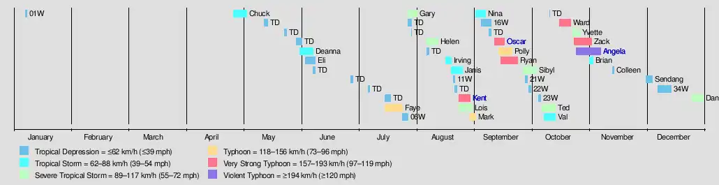 The 1995 Pacific typhoon season was a slightly below average season in terms of named storms, ending a 7-year stretch of above average activity. It occurred all year round, though most tropical cyclones formed between May and November.[1]