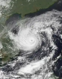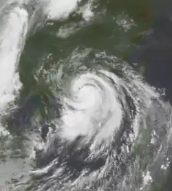 Tropical Depression 05W formed on July 15 and was named Faye the next day as it intensified into a tropical storm. On July 19, Faye became the first typhoon of the season, tied for the second latest date of the first typhoon with 1977, only behind Otto of 1998. It tracked northwestward and eventually reached a peak of 120 mph (190 km/h) 1-min winds and a minimum pressure of 950 millibars. Faye turned northward, and after weakening slightly it hit the south coast of South Korea on the 23rd, before accelerating east-northeastwards and becoming extratropical.[5] 16 people were reported dead, with moderate damage from flooding.[6]