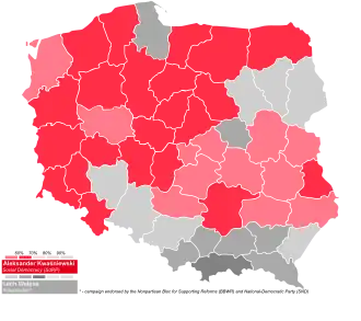 Presidential elections were held in Poland on 5 November 1995, with a second round on 19 November.[1] The leader of Social Democracy, Aleksander Kwaśniewski, and incumbent President Lech Wałęsa advanced to the second round. Kwaśniewski won the election with 52% of the vote in the run-off against 48% for Wałęsa.