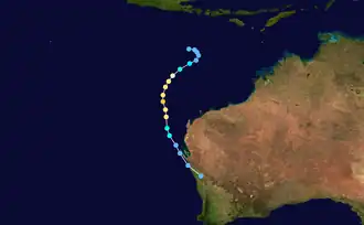 On 3 December a tropical depression formed in the Arafura Sea, 250 miles east-northeast of Darwin. The system drifted southwestward, strengthening into Tropical Cyclone Thelma on 6 December. Thelma continued to intensify as it turned to the south-southwest, reaching Category 5 strengthen on the Australian cyclone scale as it brushed the Tiwi Islands.[4] Cyclone Thelma reached a peak of 140 mph with a minimum pressure of 925 mbar on the 8th, and made landfall on the western Australian coastline on the 10th. After making landfall, the storm paralleled the coastline, and rapidly weakened to a tropical storm. Favorable conditions aloft allowed it to remain a tropical storm until the 15th, when the storm dissipated near Port Hedland. Thelma was responsible for moderate rainfall and downed trees, but caused no casualties due to the sparse population of where it hit.