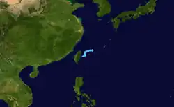 The second tropical depression of the season developed out of a tropical disturbance which was first noted 1,080 km (670 mi) north-northwest of Palau on July 6. The disturbance gradually became better organized and was classified as Tropical Depression 01W at 1500 UTC on July 7. Upon becoming a depression, it marked the latest start for a Pacific typhoon season since reliable records began in 1959.[2] The next day, 01W entered the Philippine Atmospheric, Geophysical and Astronomical Services Administration (PAGASA) area of responsibility and received the local name Akang.[3] Slowly moving towards the northwest, the depression neared Taiwan. However, increasing vertical wind shear caused the convection associated with the depression to become displaced from the center of circulation. With the center exposed, 01W weakened. At 2100 UTC on July 10, the depression made landfall in northern Taiwan and dissipated shortly after. No known damage was caused by the depression.[2]