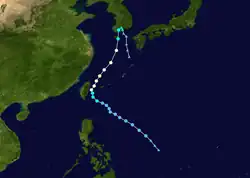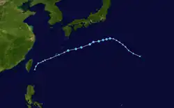 The monsoon trough spawned a low pressure system late on September 14, which developed into Tropical Storm Todd shortly thereafter. Interaction with a trough provided excellent outflow for the system, which explosively intensified over the following day, with 1-minute winds increasing from 50 knots to 130 knots in a 24-hour period ending at 06z on September 17.[23] However, the upper-level low that had been providing Todd with enhanced outflow soon began to shear it as it catapulted the storm northward and then westward, and by the time it had made landfall in China, Todd had weakened back into a tropical storm with 10-minute winds of 45 knots per the JMA.[24] Todd dissipated inland over China on September 20. Seven people were killed by Todd in Kyushu. Damage in southern Japan amounted to 31.9 million yen (US$236,436).[25]