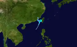 As 01W intensified over the Philippine Sea,[2] a broad area of low pressure developed in the South China Sea. The low slowly intensified as it moved towards the north-northeast and was declared Tropical Depression 02W early on July 8. Tropical Depression 02W slowly strengthened as northerly outflow was constricted. By late on July 8, the depression was upgraded to a tropical storm and given the name Nichole. The storm reached its peak intensity while just offshore southern Taiwan with winds of 95 km/h (60 mph 1-minute winds) according to the Joint Typhoon Warning Center (JTWC)[2] and 65 km/h (40 mph 10-minute winds) with a minimum pressure of 998 hPa (mbar) according to the Japan Meteorological Agency (JMA).[4] The combination of dry air, strong wind shear, and the storm's proximity to land caused Nichole to quickly weaken to a tropical depression twelve hours after reaching its peak intensity. The exposed remnants of Nichole executed a clockwise-loop offshore Taiwan before traveling north into mainland China and dissipating.[2] Rough seas produced by the storm caused four container ships to run aground in Taiwans' Kaohsiung Harbor, none of the crew members were injured. Heavy rains in Taiwan flooded an estimated 2,500 acres (10 km2) of crops.[5]
