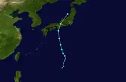 In northern Japan, near Wakkanai, Hokkaidō, severe damage to many homes took place. One person in the region was killed after being blown off his roof while trying to repair it and twelve homes were destroyed. Several rivers overflowed their banks after rainfall exceeding 200 mm (7.9 in) fell across Hokkaidō. Throughout Sōya Subprefecture, agricultural and fishing industry losses amounted to 23.1 million yen (US$171,213).[19] Severe flooding took place in nearby Abashiri Subprefecture where hundreds of homes were inundated after rivers broke their banks. Over 6,200 ha (15,000 acres) of farmland was lost. Large sections of roadways were washed away, including 14 bridges. Total losses in Abashiri reached 25 million yen (US$185,296), much of which was due to fishing industry damage.[20]